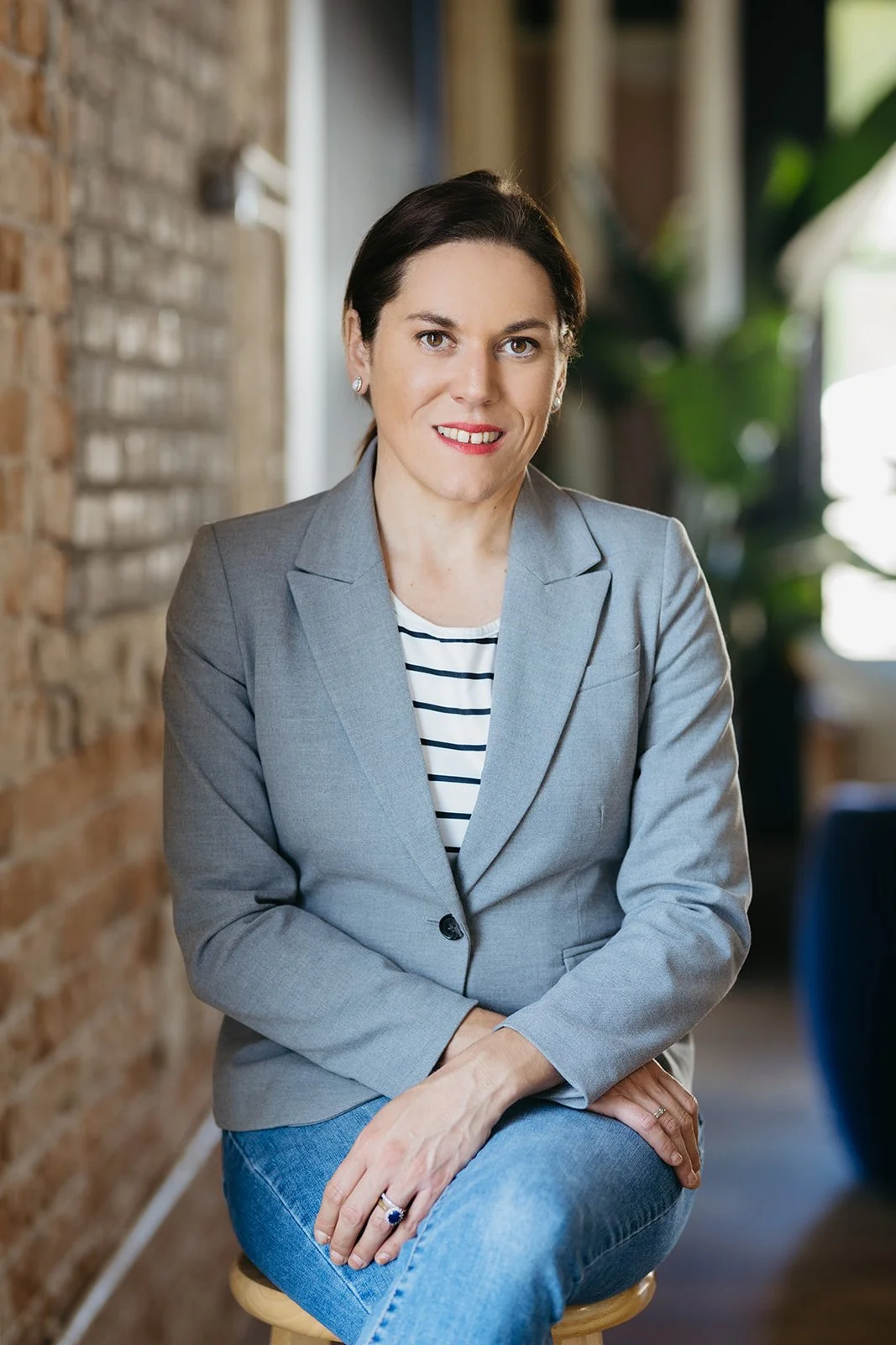 Casey sitting on a stool indoors, with a brick wall and some greenery in the background. She is wearing a gray blazer over a striped shirt and blue jeans, and is smiling at the camera.